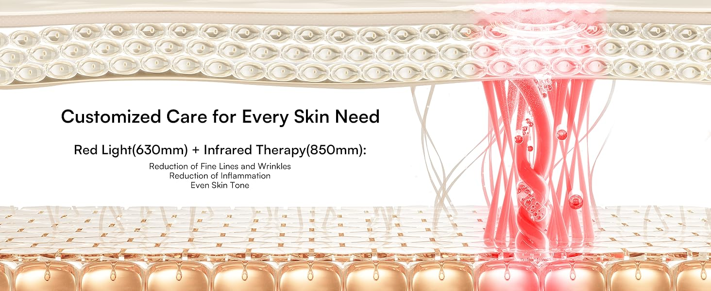 Optimized energy output and two clinically proven wavelengths of light (Blue 460nm, Amber 650nm, red 630nm and near-infrared 850nm) work on a cellular level to stimulate new collagen, reduce fine lines and wrinkles, and reduce sun damage and the visible signs of aging.