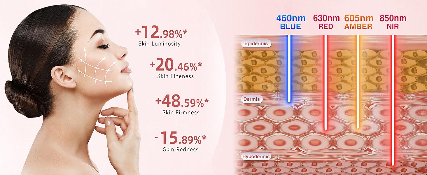 Optimized energy output and two clinically proven wavelengths of light (Blue 460nm, Amber 650nm, red 630nm and near-infrared 850nm) work on a cellular level to stimulate new collagen, reduce fine lines and wrinkles, and reduce sun damage and the visible signs of aging.